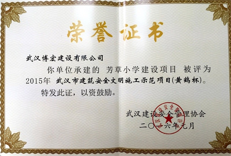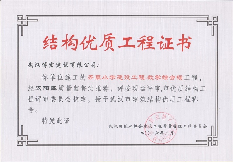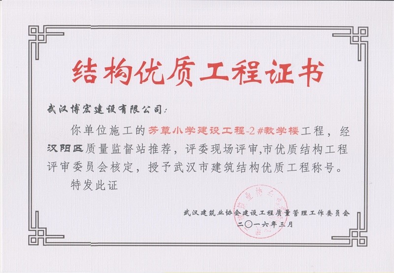 芳草小學-1#教學樓結(jié)構(gòu)優(yōu)質(zhì)工程證書