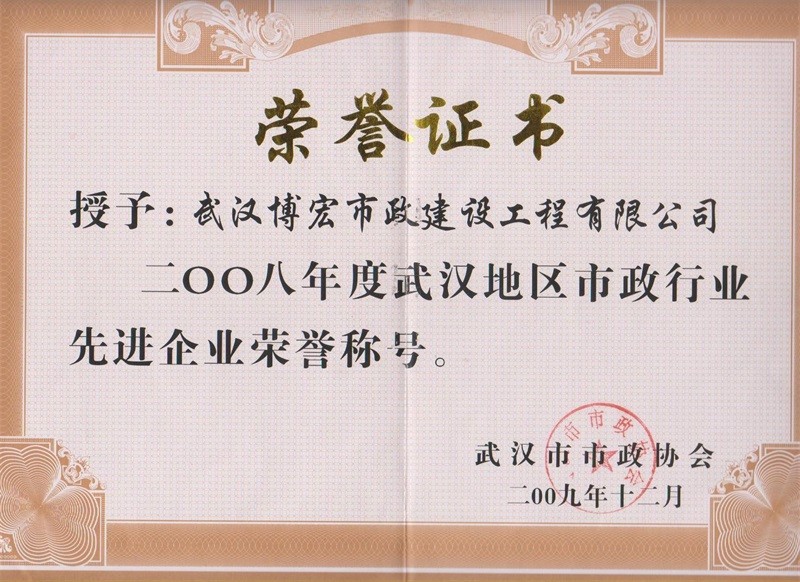2008年度武漢地區(qū)市政行業(yè)先進(jìn)企業(yè)榮譽(yù)稱號(hào)