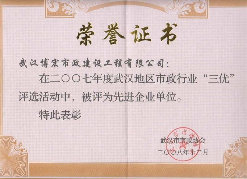2007年度武漢地區(qū)市政行業(yè)三優(yōu)先進(jìn)企業(yè)單位