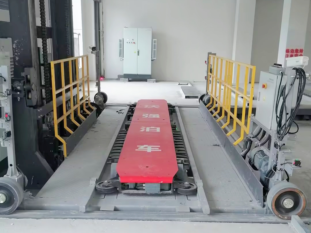 惠民苑社區(qū)服務(wù)中心改造工程EPC項目配備有地上6層的平面移動型車庫,共有127個車位,由轉(zhuǎn)盤、端部升降機(jī)、橫移臺車和梳齒搬運(yùn)器等設(shè)備組成完整的停車系統(tǒng)。轉(zhuǎn)盤設(shè)置在出入口車廳內(nèi),可實現(xiàn)汽車的轉(zhuǎn)向功能;端部升降機(jī)設(shè)置在車庫內(nèi)部巷道的側(cè)邊,可實現(xiàn)車輛的豎直提升功能;橫移臺車設(shè)置在升降機(jī)內(nèi),可實現(xiàn)車輛的橫向搬運(yùn)功能;梳齒搬運(yùn)器設(shè)置在橫移臺車內(nèi),采用電機(jī)驅(qū)動行走輪實現(xiàn)汽車縱移運(yùn)動,具有運(yùn)行平穩(wěn)、承載能力強(qiáng)的特點;車庫總控制設(shè)備設(shè)置在一層監(jiān)控室內(nèi),用于所有停車機(jī)電設(shè)備的控制和調(diào)度。
